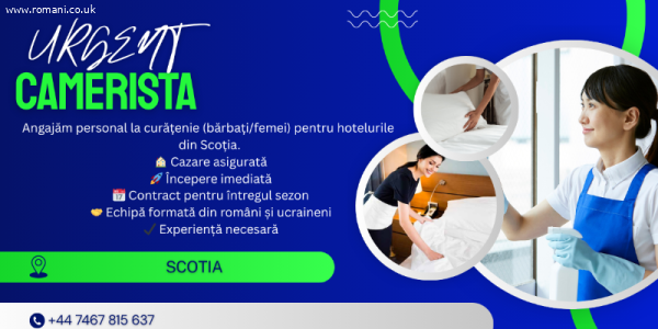 Angajăm personal de curățenie (bărbați/femei) pentru un hotel din Scoția.? Cazare asigurată